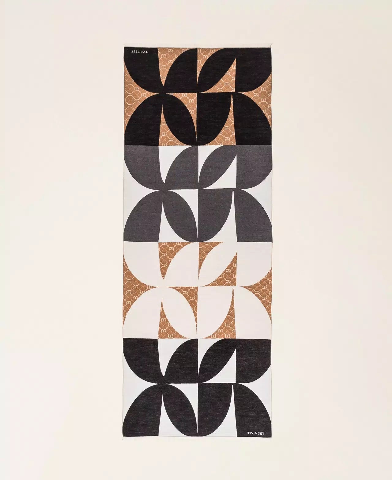 Stola in panno jacquard con motivi geometrici e Oval T all over, fondi rifiniti da frange.