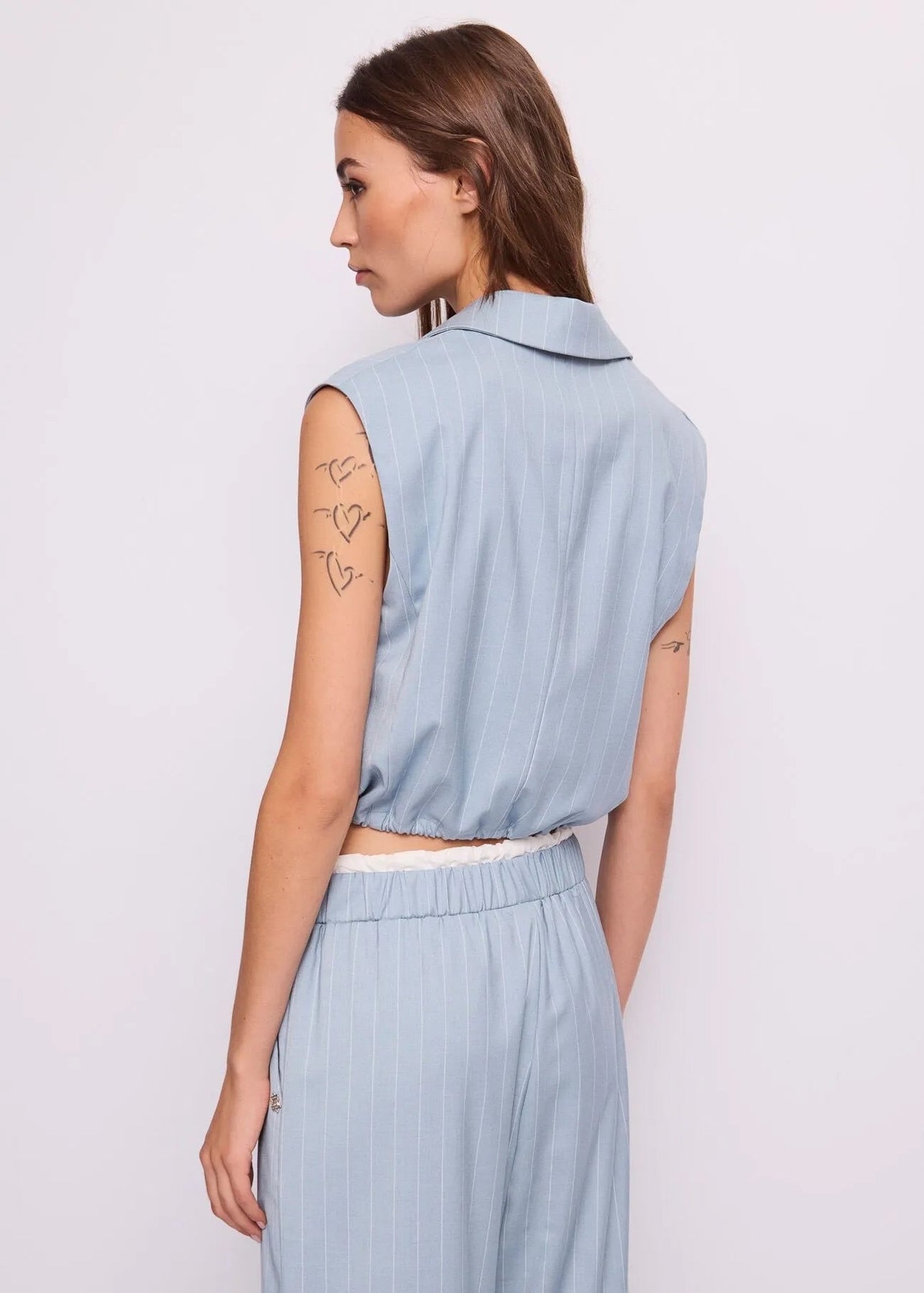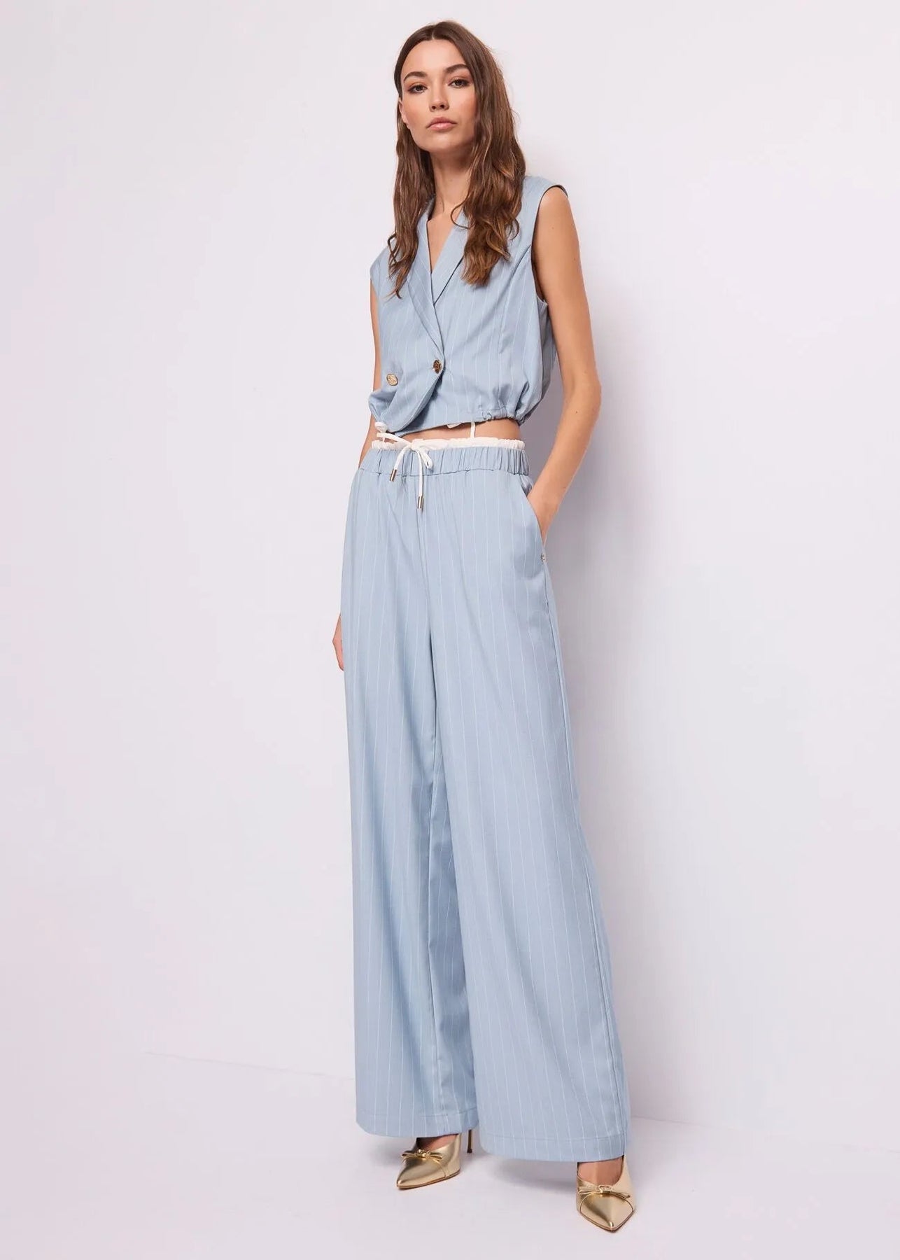 Scegli il gilet da donna doppiopetto in viscosa elasticizzata con motivo gessato, collo a revers e bottoni dorati linea Gaudi Jeans. Per un’eleganza fresca e contemporanea.