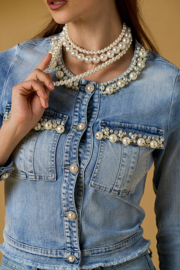Nosecrets Milano Giubbino in jeans con ricamo perle sul collo e sulle tasche frontali.