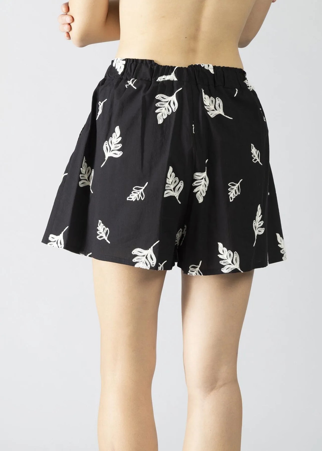 Short in mussola di cotone ricamato in contrasto con elementi botanici, con pieghe sul davanti e dettaglio logo.