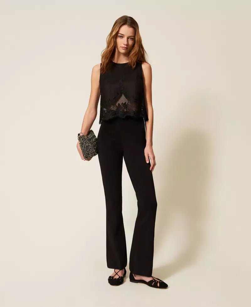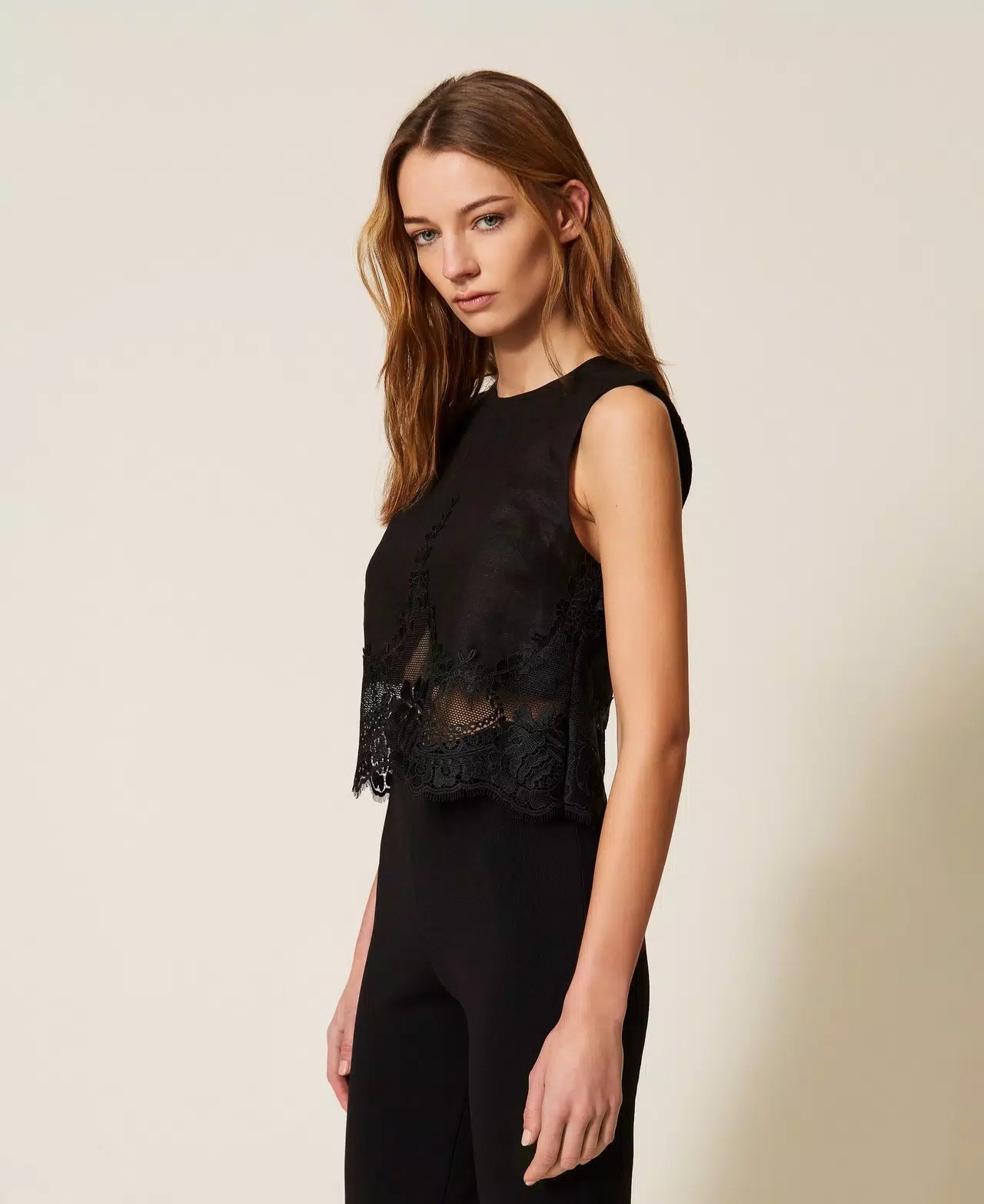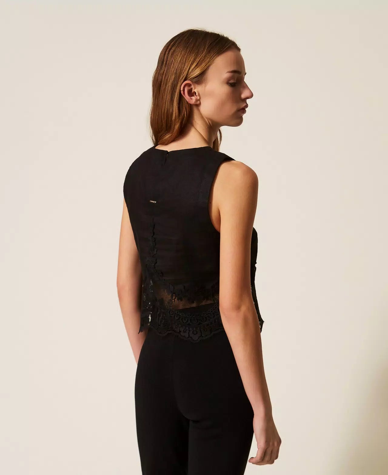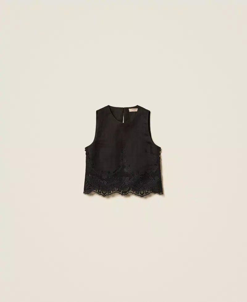 Top in lino con pizzo intarsiato al fondo in trasparenza. Ha collo tondo, apertura a goccia con bottone sul retro, linea dritta.