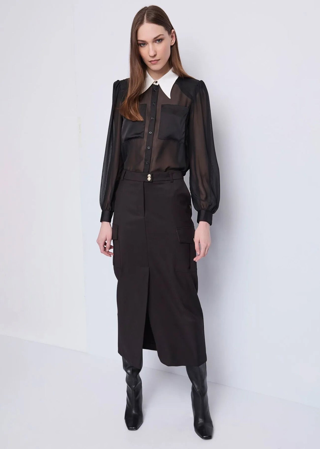 Scegli la camicia in georgette con colletto in raso a contrasto, maniche lunghe e taschini sul petto. Per un'eleganza raffinata e seducente.