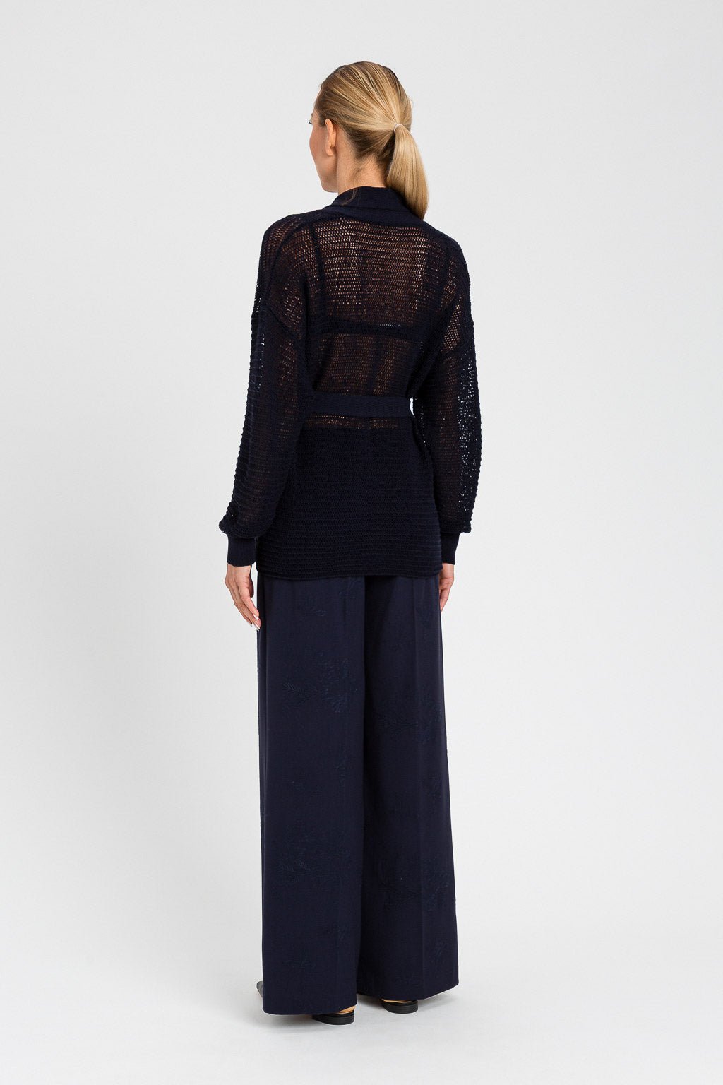Twinset Cardigan blu in cotone lavorazione a rete con tasche e cintura.