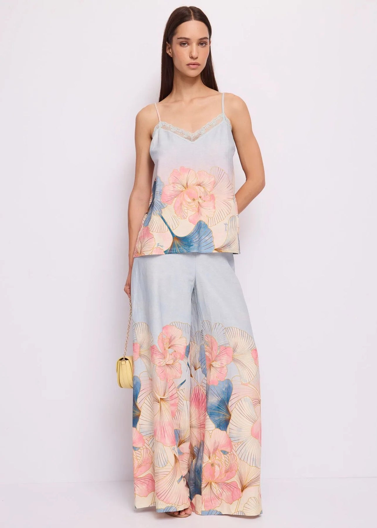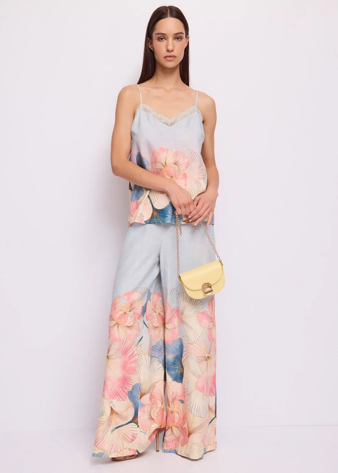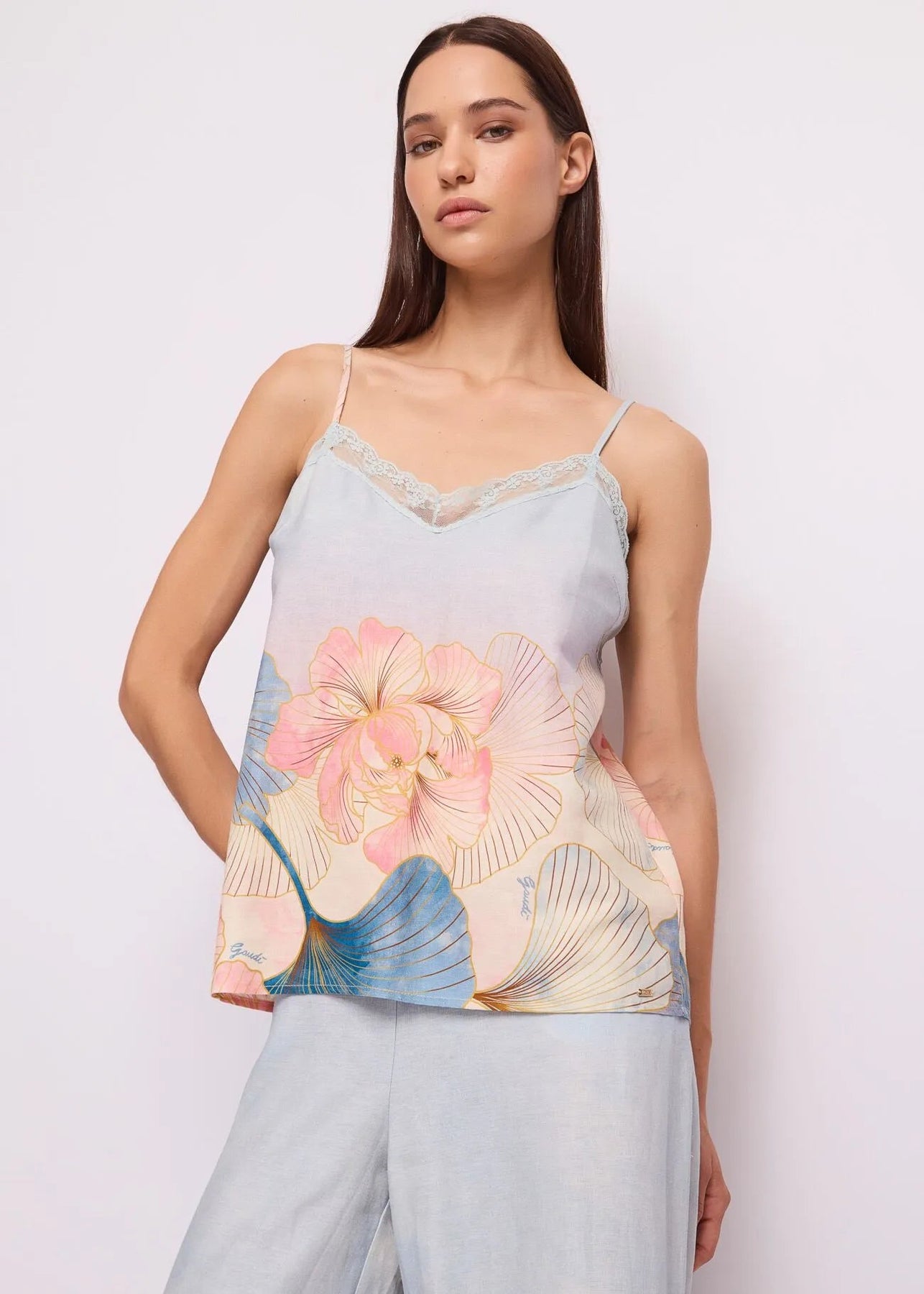 Scegli il top Gaudi in misto lino con stampa floreale, dettagli in pizzo e spalline regolabili. Fresco e leggero per un look che emana vibrazioni estive.