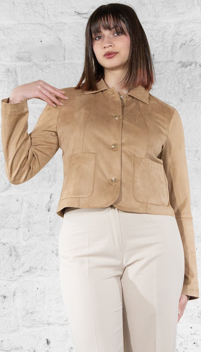 Gaudi Donna Giacca corta scamosciata con colletto ,chiusura bottoni e tasche a toppa applicate davanti.