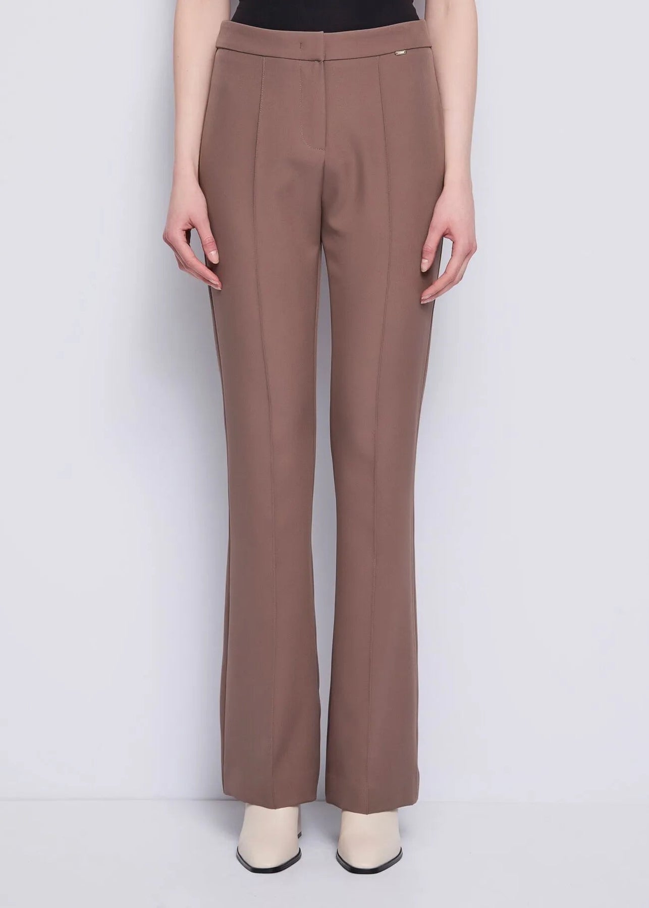 Scegli i pantaloni flare in tessuto tecnico elasticizzato con piega cucita, vita alta e logo in metallo. Vita alta per un'eleganza minimal chic.