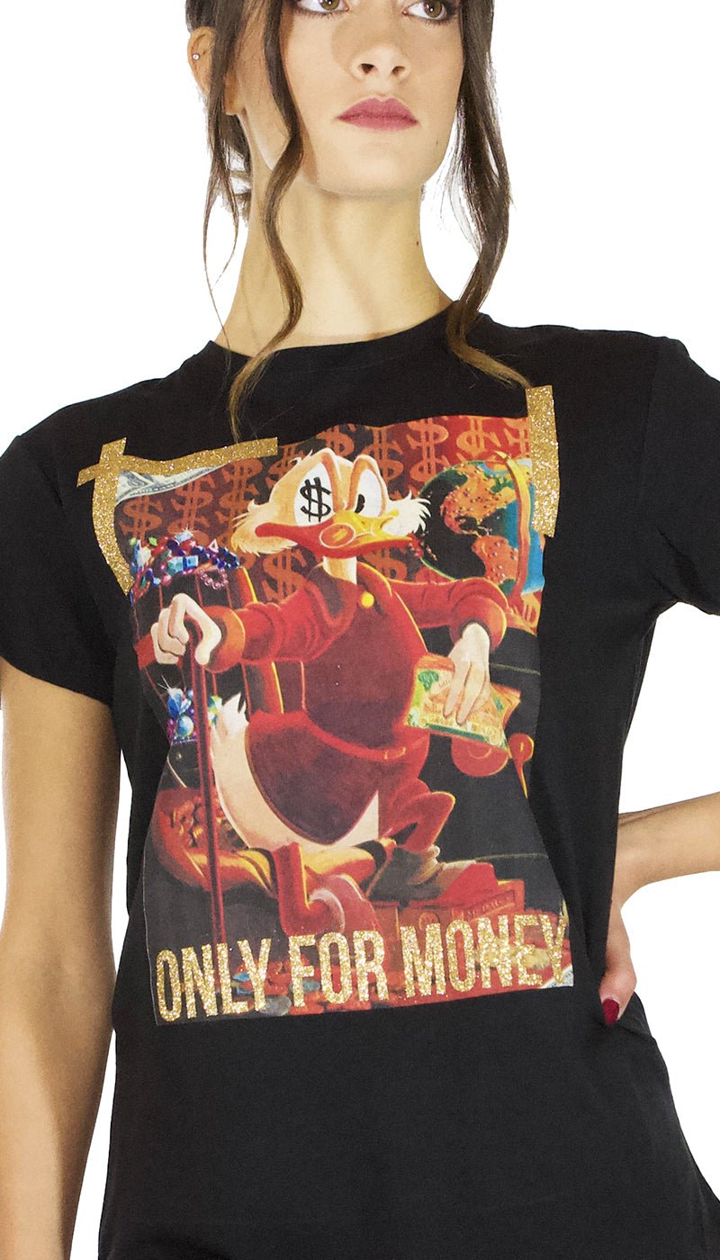 T-shirt donna Gli Psicopatici nera in cotone manica corta stampa Zio Paperone e scritta only for  money in lurex oro.