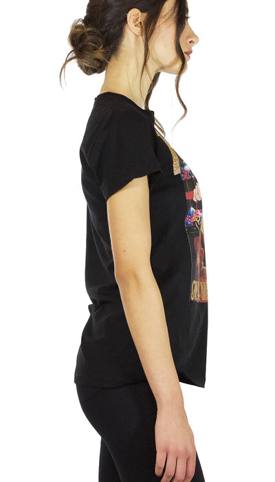 T-shirt donna Gli Psicopatici nera in cotone manica corta stampa Zio Paperone e scritta only for money in lurex oro.