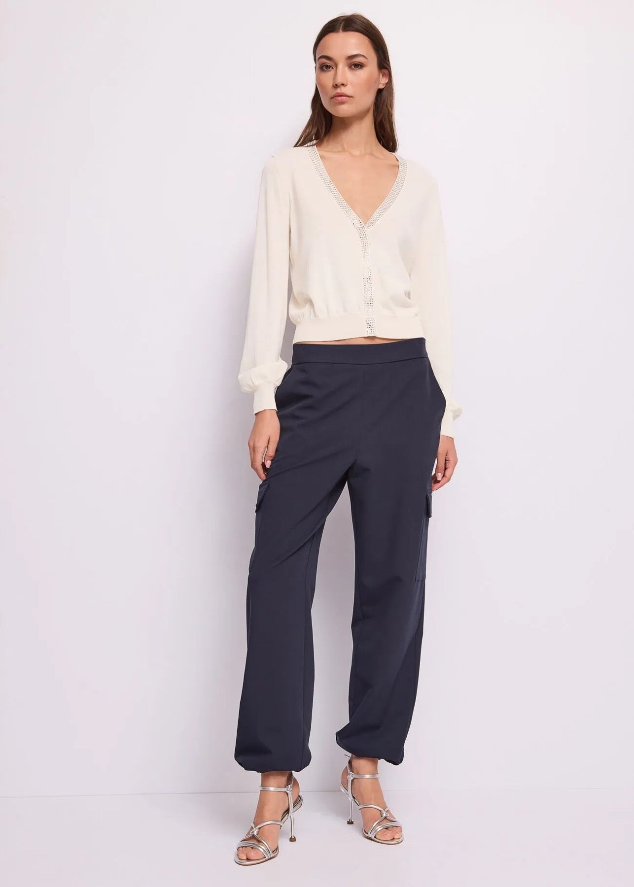 Scegli il cardigan gaudì jeans in morbido filato con scollo a V e strass. Per un'eleganza morbida, confortevole e raffinata.