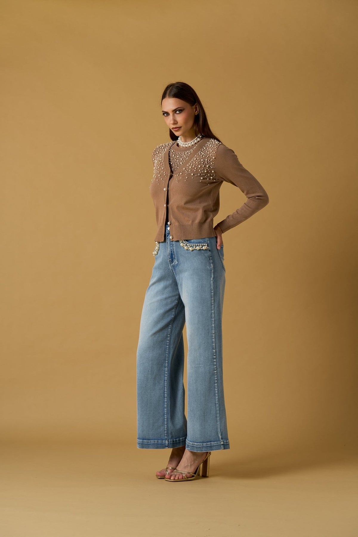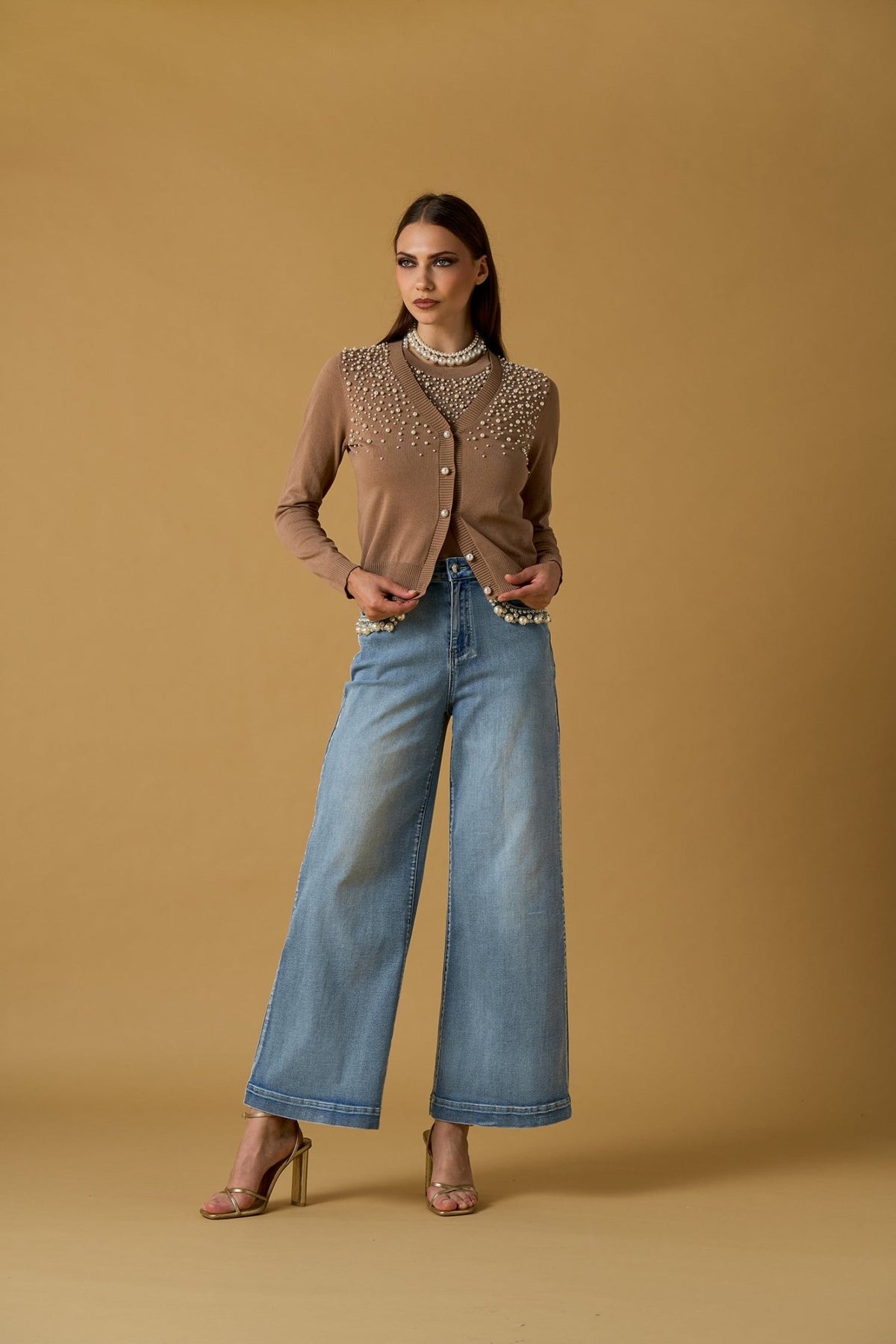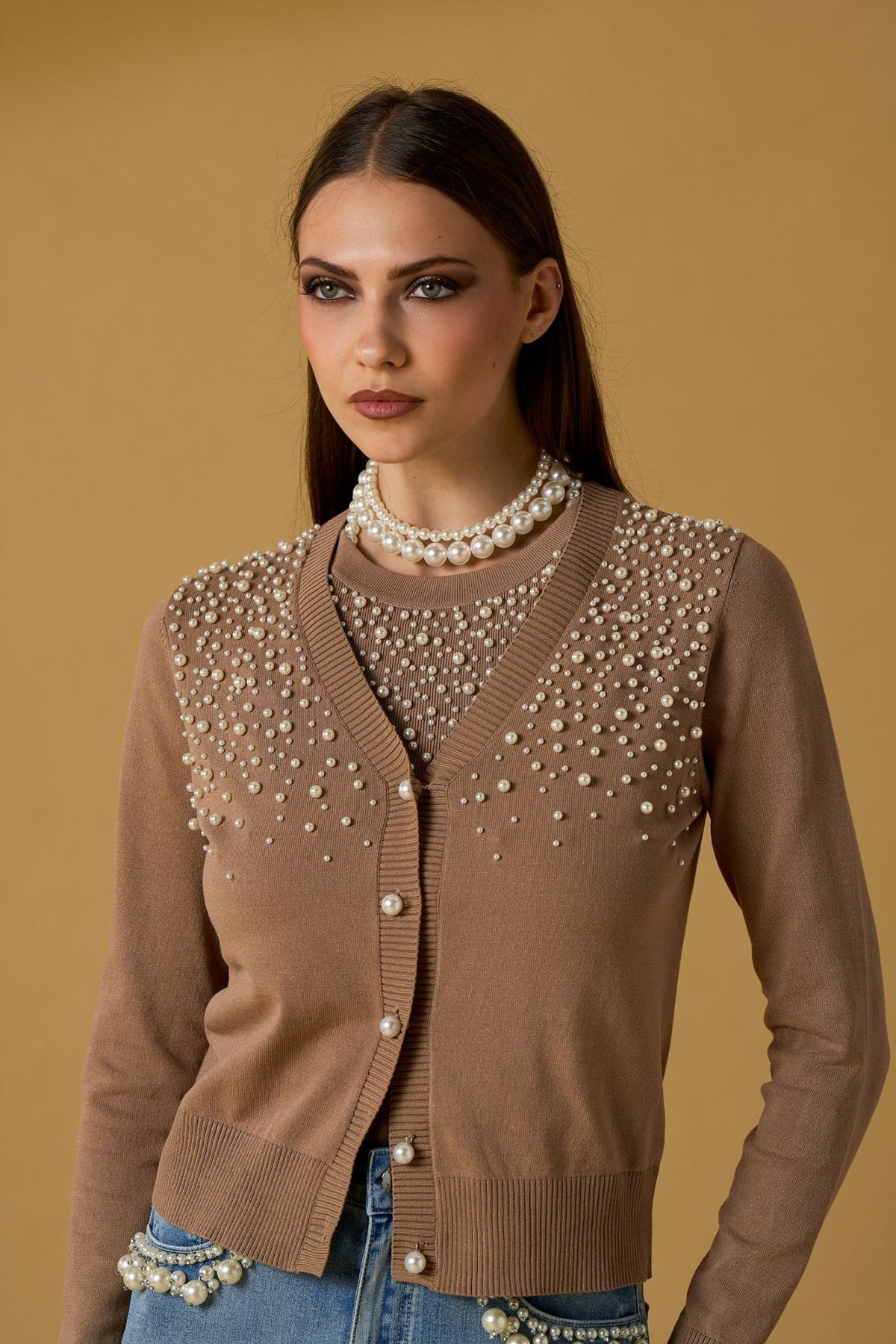 Giacchino / Cardigan marrone in viscosa con perle linea Nosecrets Milano