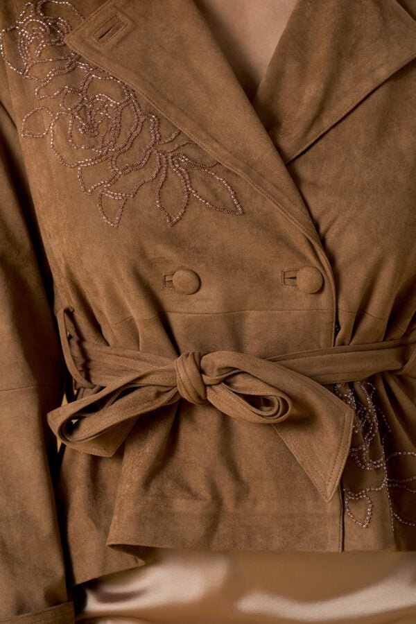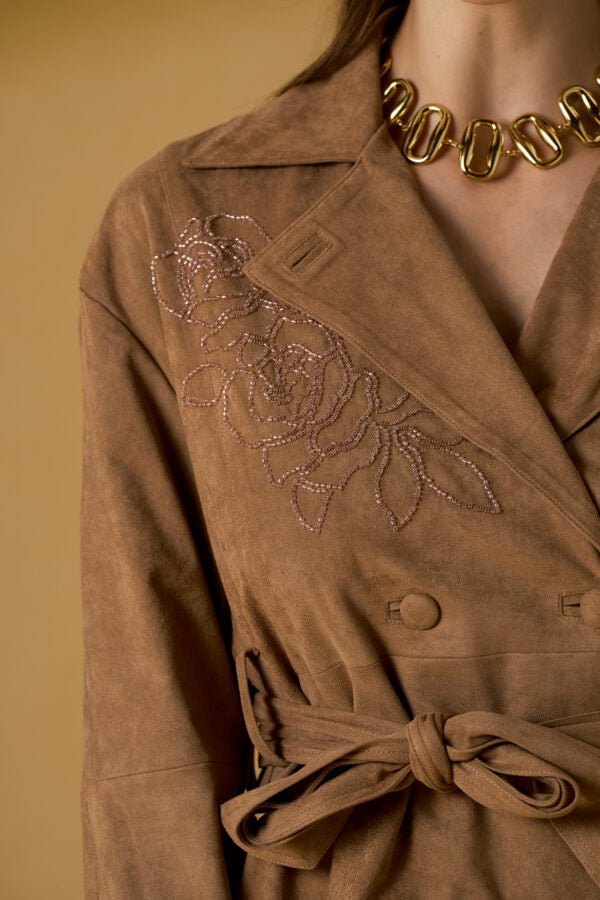 Nosecrets Milano Giacca modello chiodo in eco camoscio con ricami di coralli e cintura.