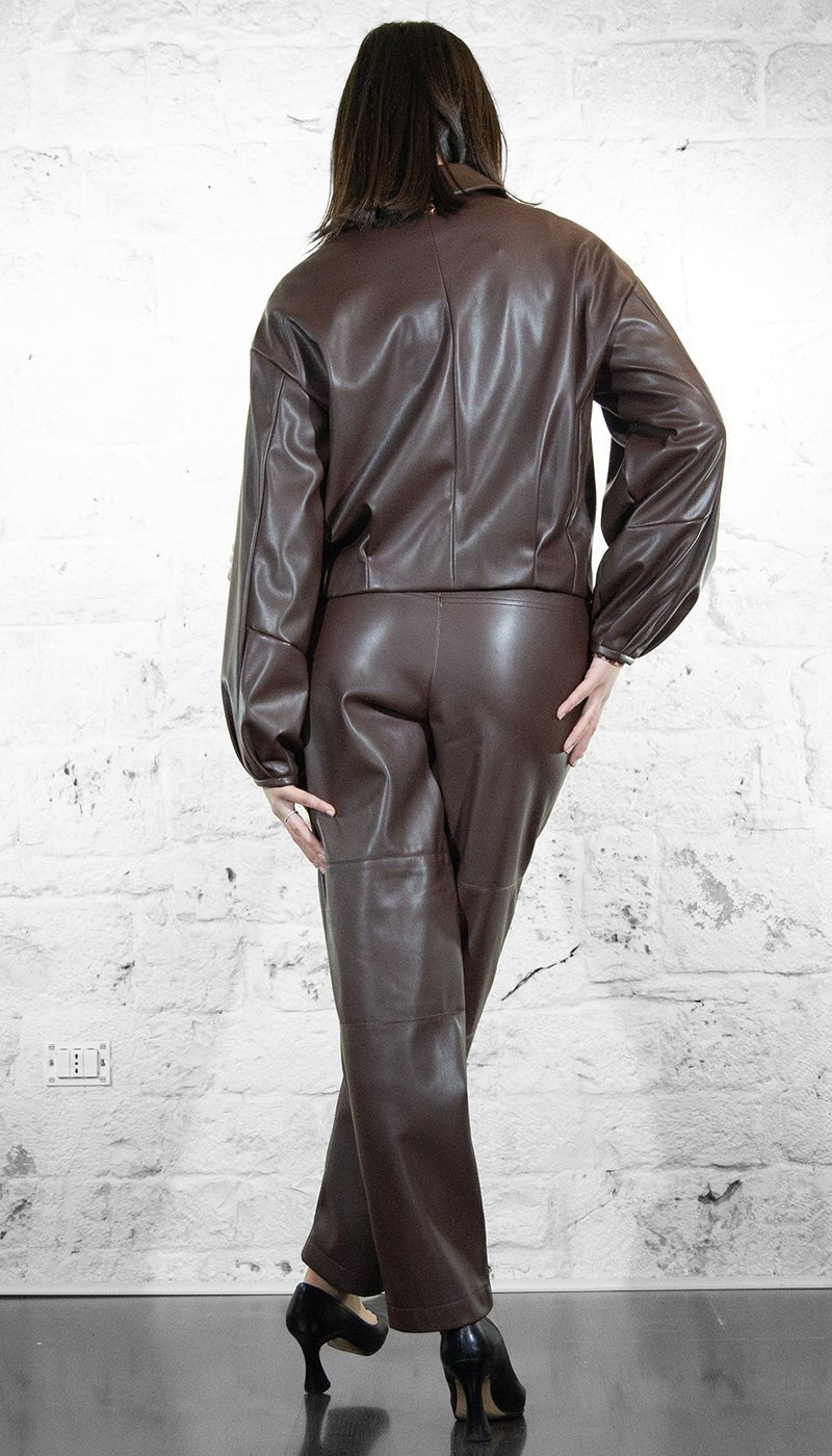 Giacca effetto pelle con colletto a camicia, chiusura con bottoni a pressione ricoperti, maniche lunghe morbide balloon con arricciatura, fodera, linea dritta.