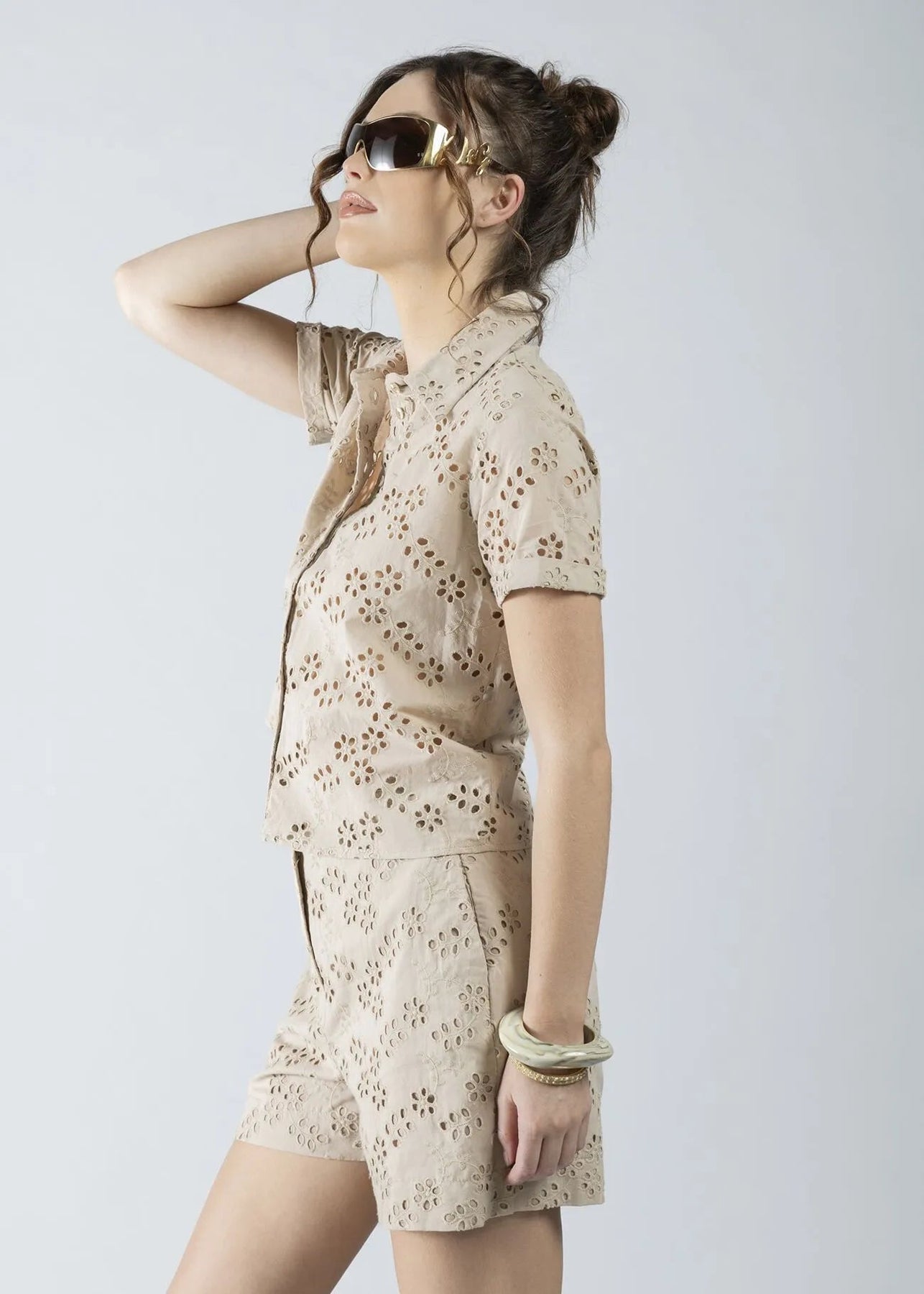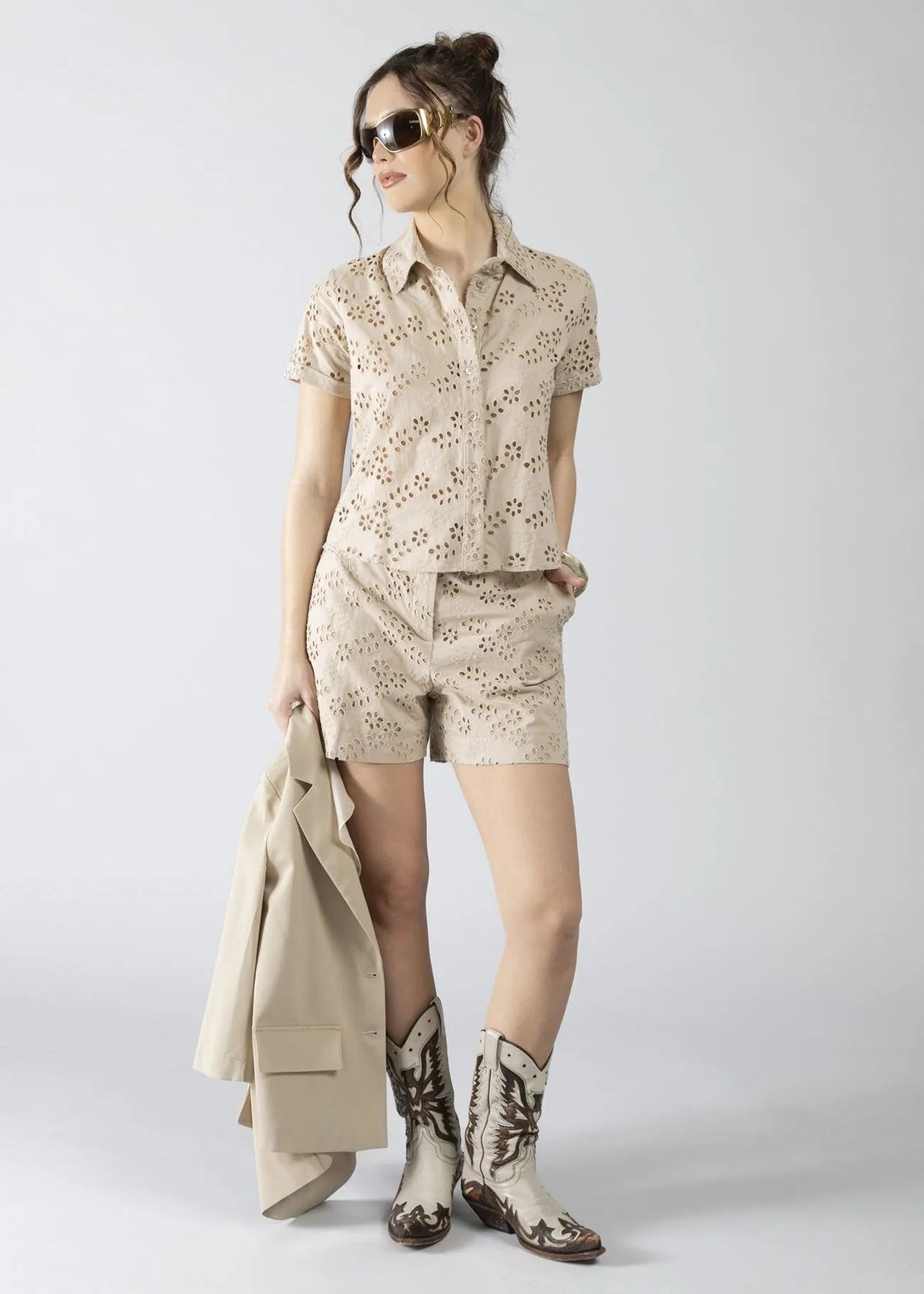 Camicia Denny Rose Jeans a manica corta in sangallo di cotone, con collo classico, chiusura sul davanti e dettaglio logo.